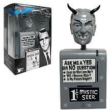 Bif Bang Pow! The Twilight Zone Bobble Head Mystic Seer. Look into the future...with The Twilight Zone Bobblehead - Mystic Seer! From the The Twilight Zone episode "Nick of Time," this Bobblehead includes fortune-telling cards! Wouldn't this look great on top of your TV set? Based on the classic The Twilight Zone episode "Nick of Time" that starred William Shatner, this terrific Mystic Seer Bobblehead measures about 6 1/2-inches tall x 3-inches wide x 2 1/4-inches deep, and it even includes fortune-telling cards as part of the packaging. Wouldn't this look great on top of your TV set?"The hand belongs to Mr. Don S. Carter, male member of a honeymoon team on route across the Ohio countryside to New York City. In one moment, they will be subjected to a gift most humans never receive in a lifetime. For one penny, they will be able to look into the future. The time is now, the place is a little diner in Ridgeview, Ohio, and what this young couple doesn't realize is that this town happens to lie on the outskirts of the Twilight Zone."NOTE: This item is a Bobblehead; it is not a full-size working replica of the Mystic Seer. "You're traveling through another dimension, a dimension not only of sight and sound, but of mind. A journey into a wondrous land whose boundaries are that of imagination. That's the signpost up ahead. Your next stop...the Twilight Zone." (Spoken by Rod Serling at the beginning of each The Twilight Zone episode.)Toys 'R' Us and Entertainment Earth guarantee that in-stock action figure and toy packaging is shipped in the best condition and is the best possible packaging available anywhere, unless otherwise noted in a product's name or description. "Mint Condition Guaranteed", and the "Mint Condition Guaranteed" logo are trademarks of Entertainment Earth, Inc. Used with permission.