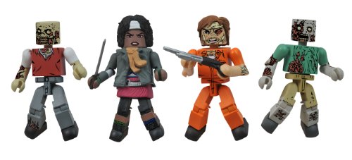 Diamond Select Toys Walking Dead Minimates Prison Outbreak, 4-Pack (Amazon Exclusive). A Diamond Select Toys release. Designed and Sculpted by Art Asylum. The original comic book that inspired the Walking Dead TV show has published over 100 issues, and now Diamond Select Toys and Art Asylum have released this Amazon-exclusive four-pack of Minimates mini-figures inspired by the comic. With a battle-damaged Rick in his prison garb, fan-favorite zombie-killer Michonne and two exclusive zombies, this set is a must-have item for any fan of the comic book, TV show, or zombies in general. Each Minimates stands 2 inches tall with 14 points of articulation and a variety of interchangeable parts and accessories.