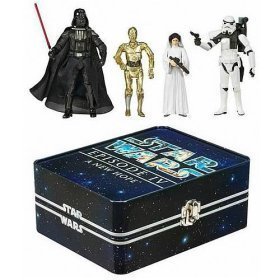 Star Wars Episode 4 Collectible Tin. Name: Star Wars Tin SetManufacturer: HasbroSeries: Saga '06Release Date: Something new! These gift packs include a specially decorated tin with artwork from the Star Wars saga, and will include 4 unique action figures from that movie! Packaged on blister cards with the figures, this new item has the 2007 packaging look and is sure to be awesome.